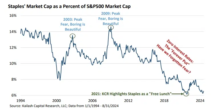 In Part I of our work on Consumer Staples stocks we provided data demonstrating that: 1. Staples stocks had generated the highest risk adjusted return of any sector over the last 30 years 2. That relative to the S&P500 Staples were as cheap as they were at a. The peak of the dot.com bubble and b. The peak of the Covid bubble – a moment when we pounded the table on Staples to great effect 3. Investor interest in Staples’ reliable earnings and income features had fallen to never before-seen lows