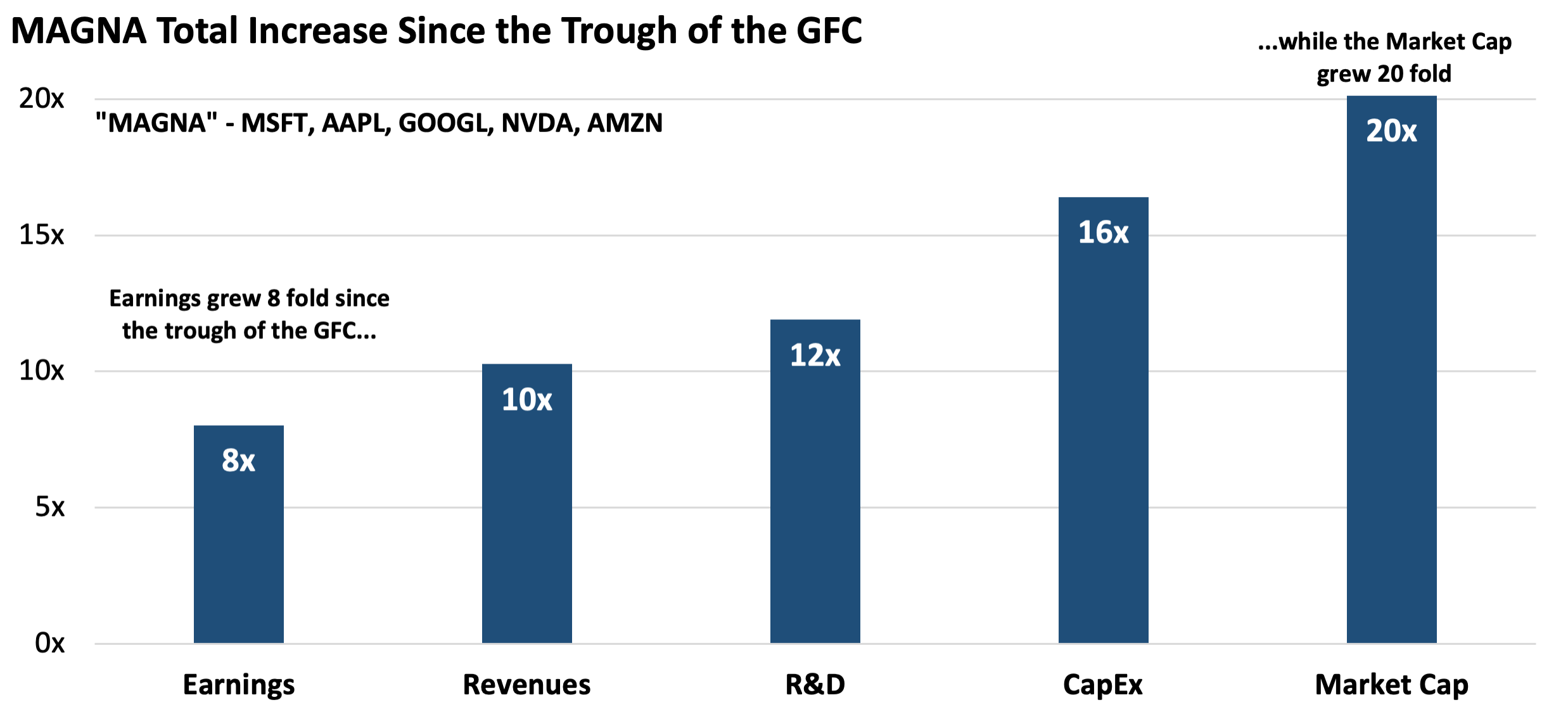 Since the trough of the GFC, we can see the various growth rates of earnings, sales, R&D, capital expenditures, and…market cap. The numbers tell a story of extraordinary earnings and sales growth. But costs – both expensed and capitalized – have grown faster. Despite this, these five firms’ market caps have grown an incredible 20-fold. This is multiple expansion gone mad.