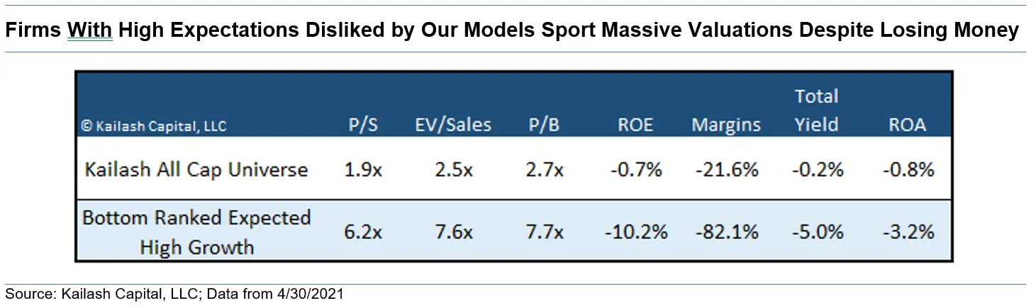 The stock market as defined by our All Cap Universe trades at only 1.9x price to sales (P/S). Compare that to the firms with the highest expectations, that our ranking tools dislike in the second row which trade at 6.2x sales – a terrifying multiple.