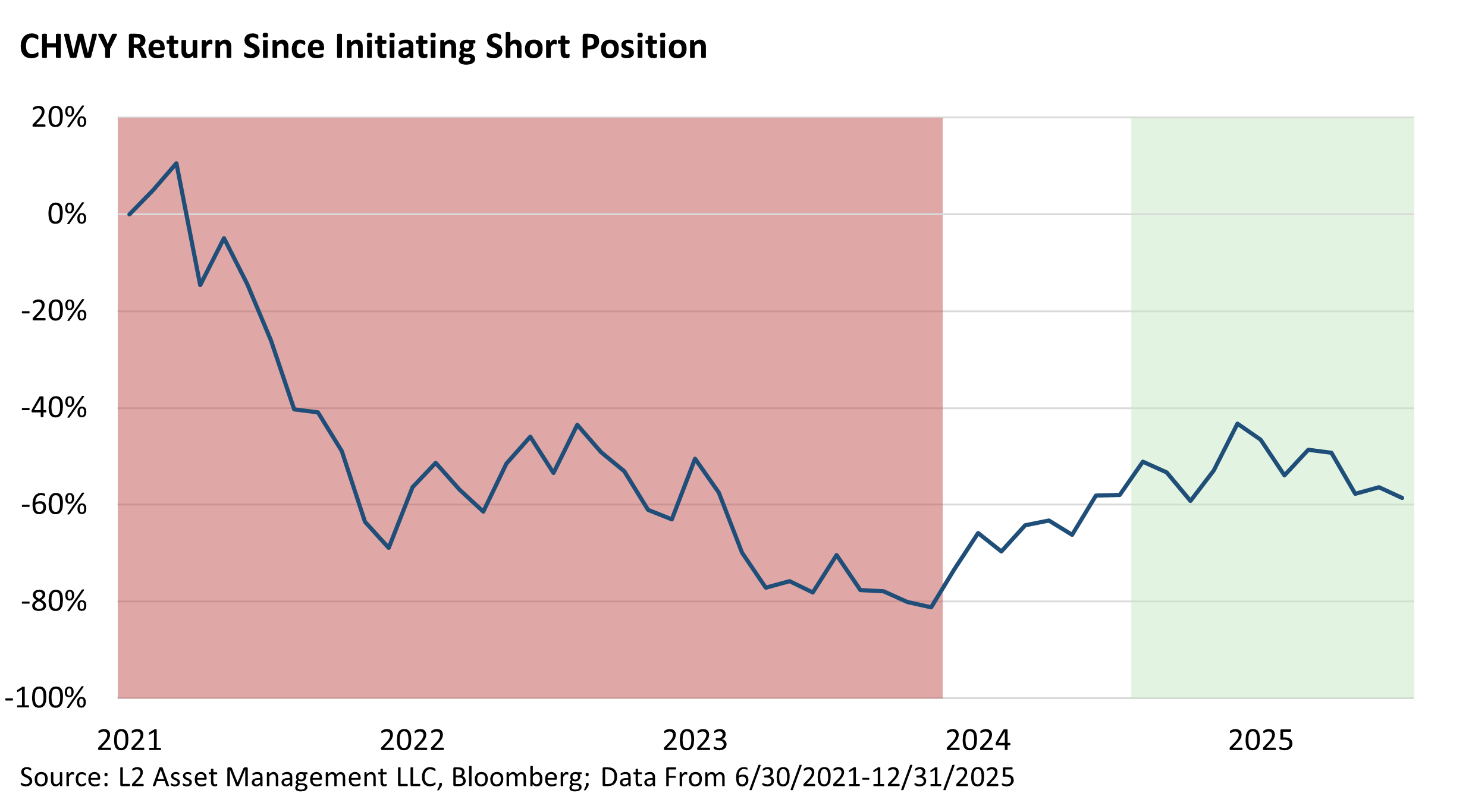 To us the short thesis was simply “the bull thesis, and a great deal more, has already been baked in.” In the chart below we show the period our hedge fund strategies held short positions in CHWY. The line is the stock price of CHWY. The area shaded in red is where our sister company’s hedge funds held a short position (we make money when the stock falls). You can see there’s a stretch there with no color. That’s because CHWY wasn’t good and cheap enough to buy but was also no longer a “safe” stock to be short.