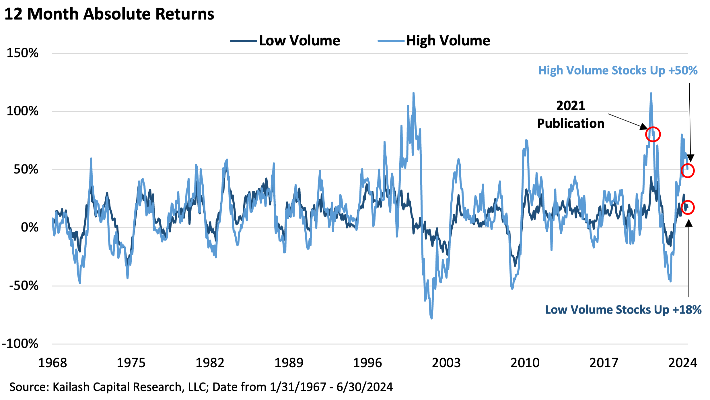 • The navy-blue line shows the 12-month returns to the 20% of stocks with the lowest volume