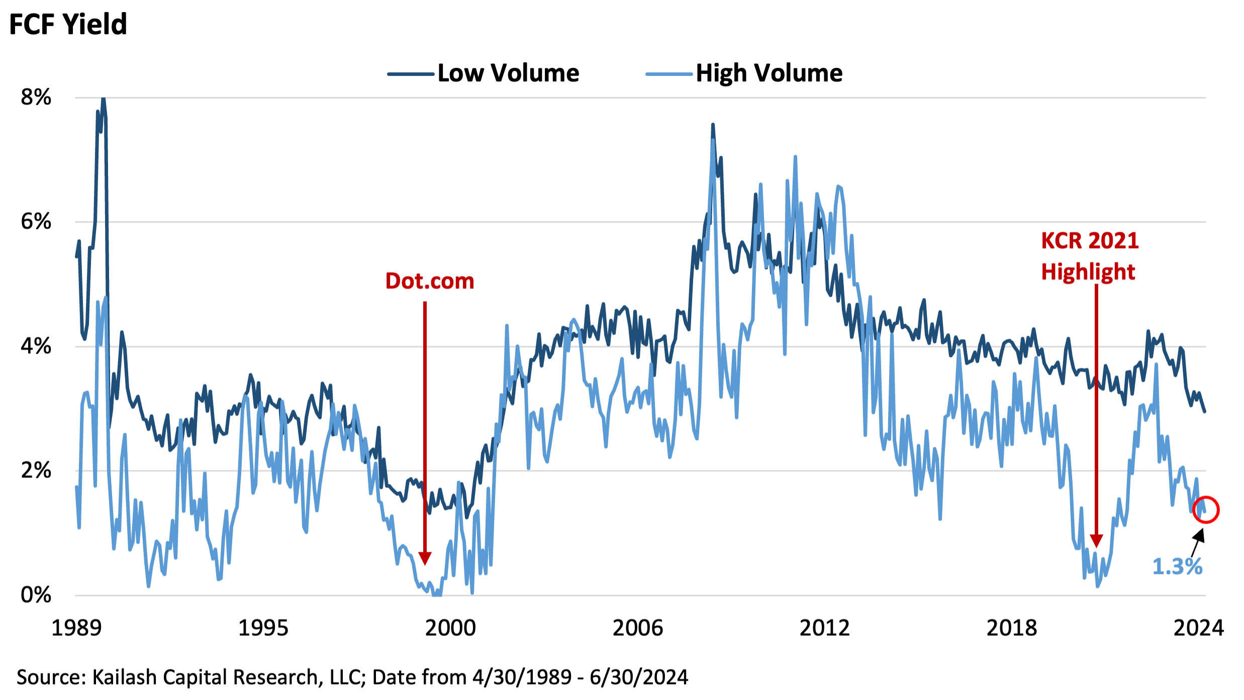 Once again, we have bracketed the dot.com period and the moment in 2021 when KCR first highlighted these two groups. You can see that at those times, the high-volume stocks had FCF yields of ~0%.