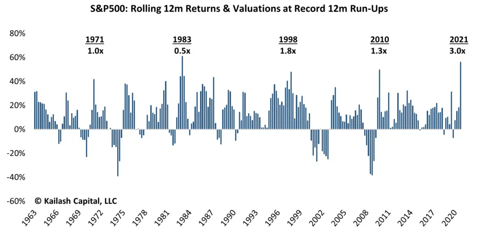 - The 12 months ending in March 2021, the S&P was up 56% – the third highest return in history