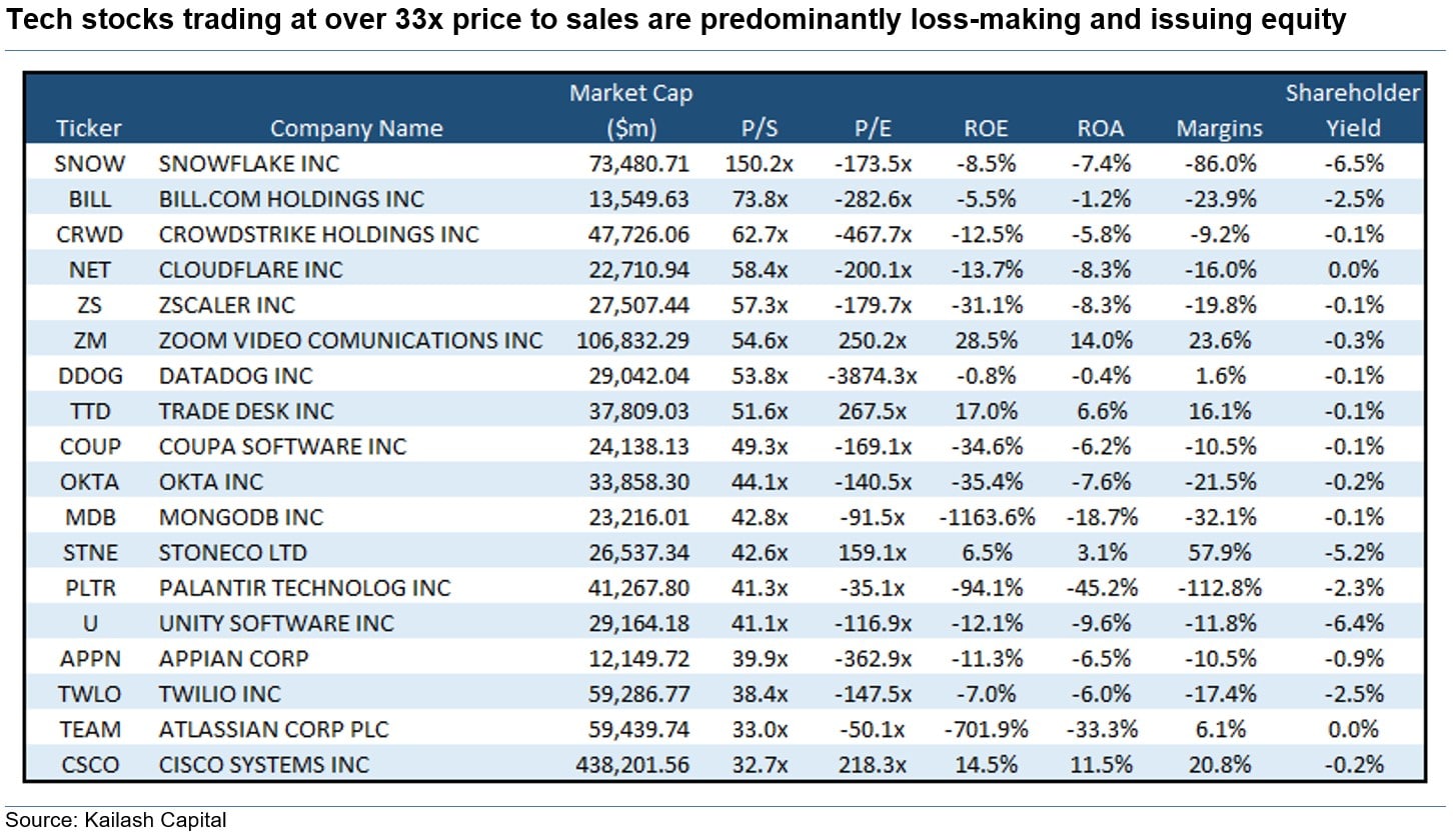 Many of us here at Kailash sport gray hair and have proven ourselves no match for the rip-roaring rise of tech-heavy index funds to even more concentrated specialty ETFs. While “growth” and “value” have traded blows for the majority of the post-2010 period, Kailash has documented, in Fig. 2 of this paper and Fig. 1 of this paper, that the ballistic rise of many highly speculative firms, such as clean technology stocks, occurred in the years since 2017. Today Kailash believes market participants are standing on a dangerous precipice. Below we have provided a list and some simple salient fundamentals of all the Tech stocks trading over 33x Price to Sales. Why 33x? More on that in a moment.