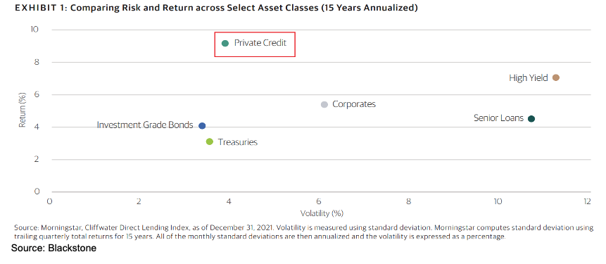 They lead with the chart below. In it, you see that “Private Credit” has returned[1] nearly 4x Treasuries with almost the same risk. You can also see that the asset class has nearly doubled the returns of Senior Loans with less than half the risk. Quite an achievement. (Red box is ours.)
