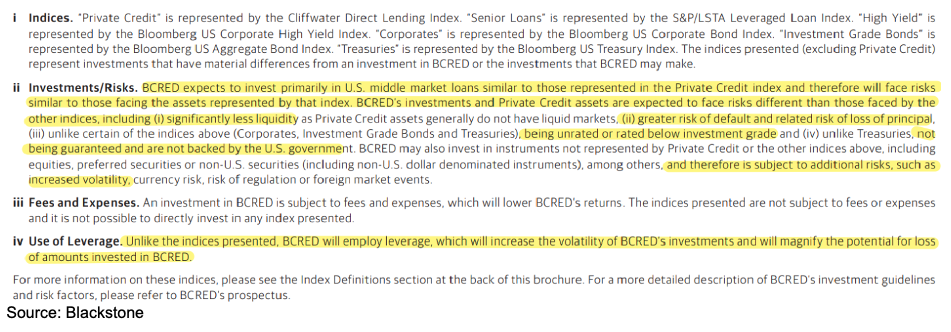 The footnotes are a testament to transparency and caution. BCRED will make loans similar to those in the Cliffwater index. But Blackstone cautions that BCRED faces different risks than the other indexes. Specifically: