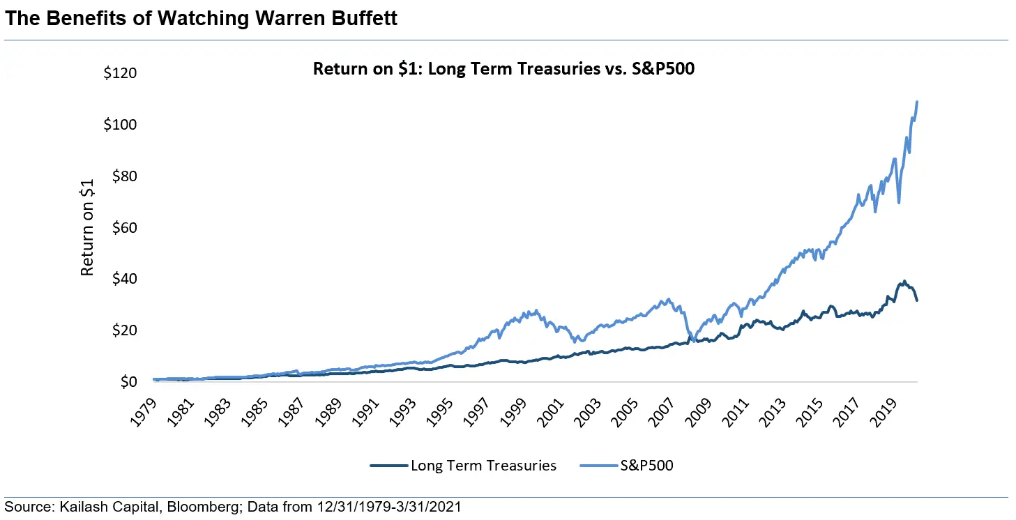 As mentioned above, Kailash believes that our investment tools are potent stuff. That belief stems from the fact they were built based on the empirical data from history – not from a set of preconceived notions. Kailash republishes Buffett’s quote from 1980 discussing how bonds, which were paying interest at 12% then, were a losing proposition vs. equities. Incredibly, he contextualizes the idea by addressing how the two assets might perform between 1980 and 2020.