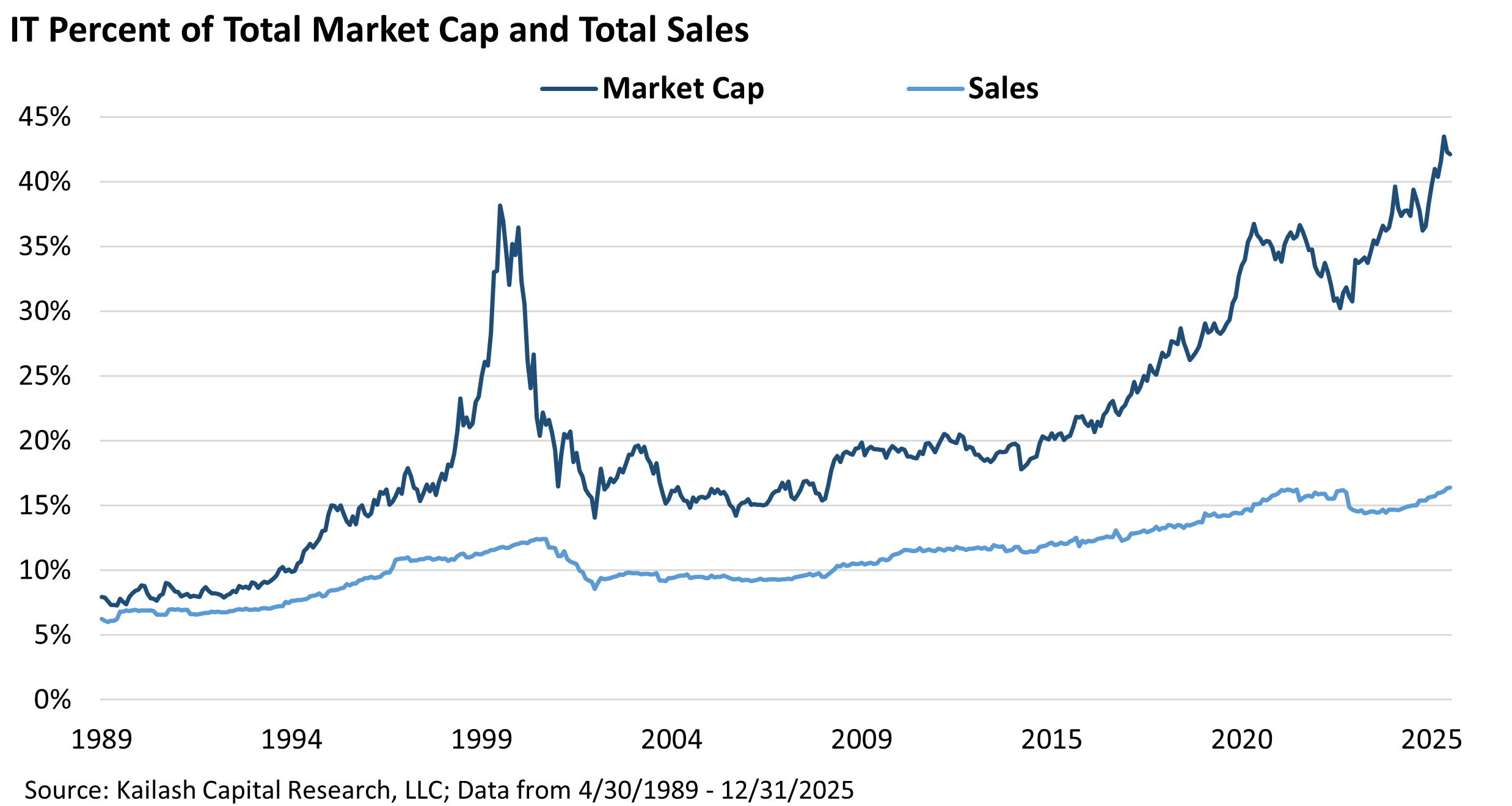 - Tech now exceeds 42% of market cap but under 15% of sales.