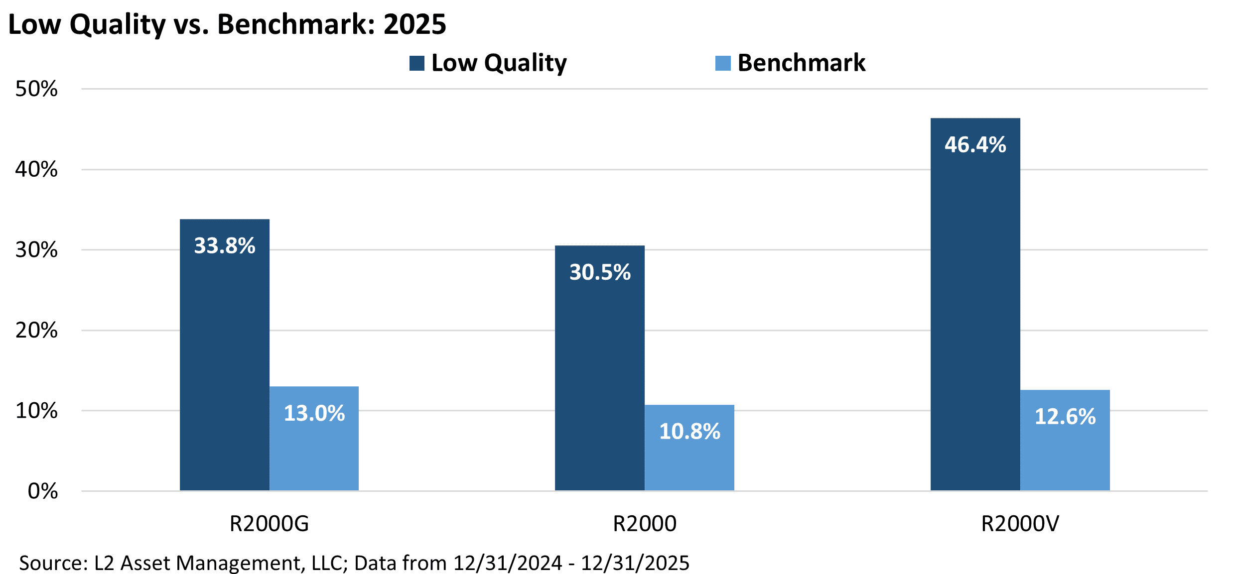 - Russell 2000 Value low-quality names returned 46.4% vs. 12.6% for the index.