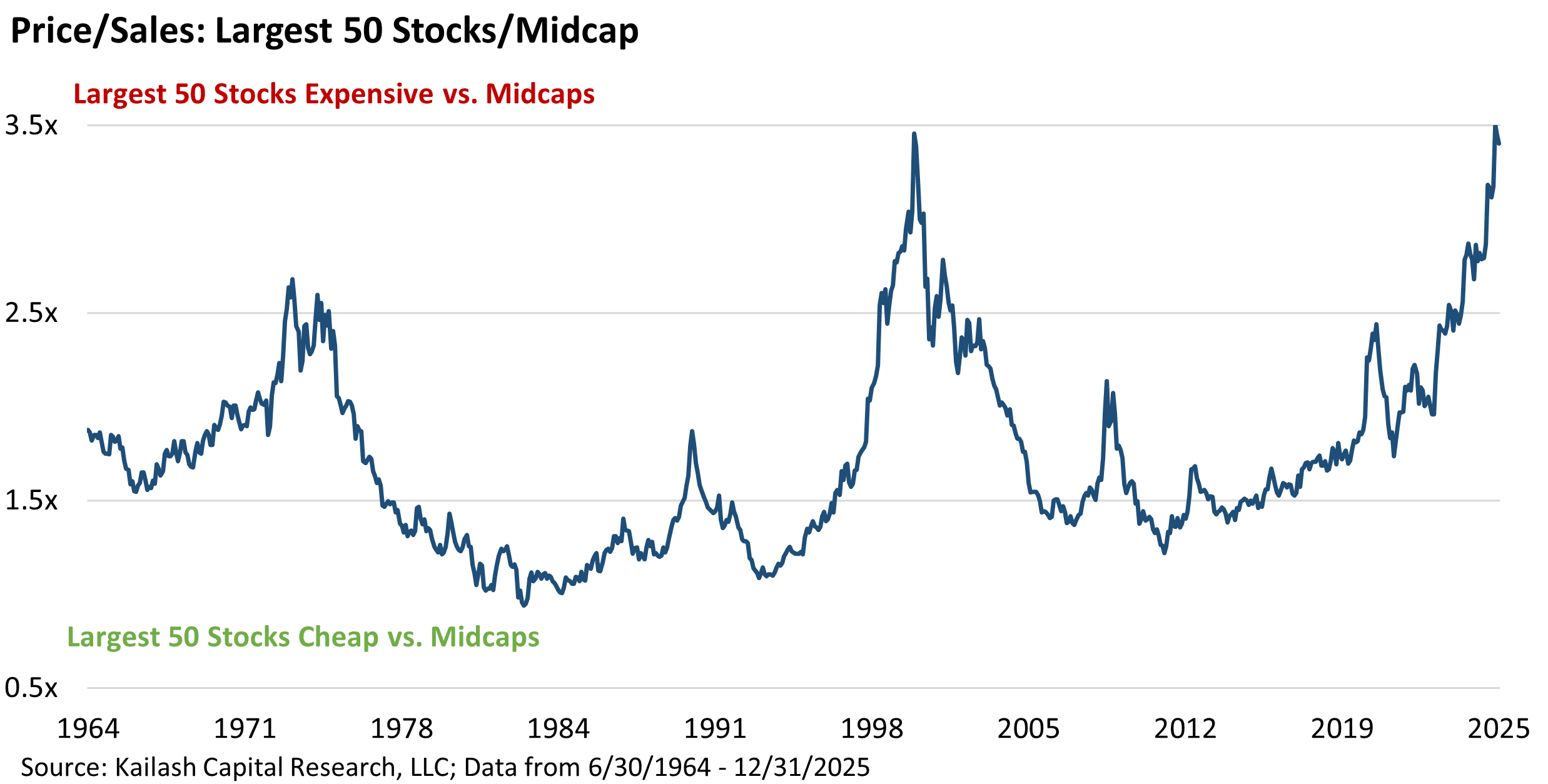 - Relative valuation is screaming: the largest-50 vs. midcap P/S ratio hit ~3.3x, above prior peaks (including 2000)—a level that has historically preceded sharp reversals.