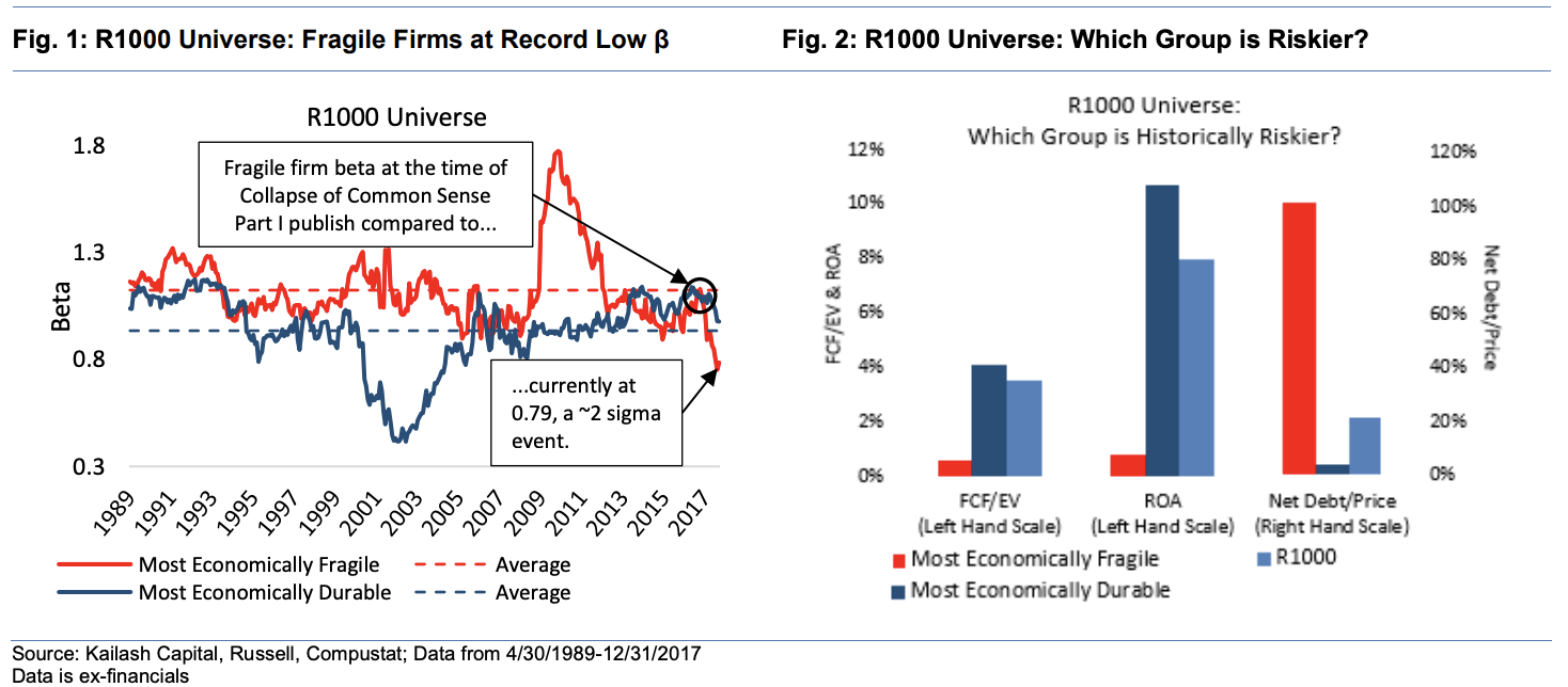Kailash’s last two papers focused on what we view as the untenable and unsustainable disconnect between perceived risk as measured by price action in Beta calculations and actual business fundamentals. In our first paper, The Collapse of Common Sense we documented that firms with the lowest EBITDA/net-debt ratios and low free-cash-flow yields and poor returns on assets were showing up as being less risky than firms with the highest levels of EBITDA relative to net-debt which had atypically high FCF yields and returns on assets. In our follow-up paper The Collapse of Common Sense II we worked on how best to utilize the Kailash ranking methods to try and exploit the best and worst of these “Durable” and “Fragile” firms.1