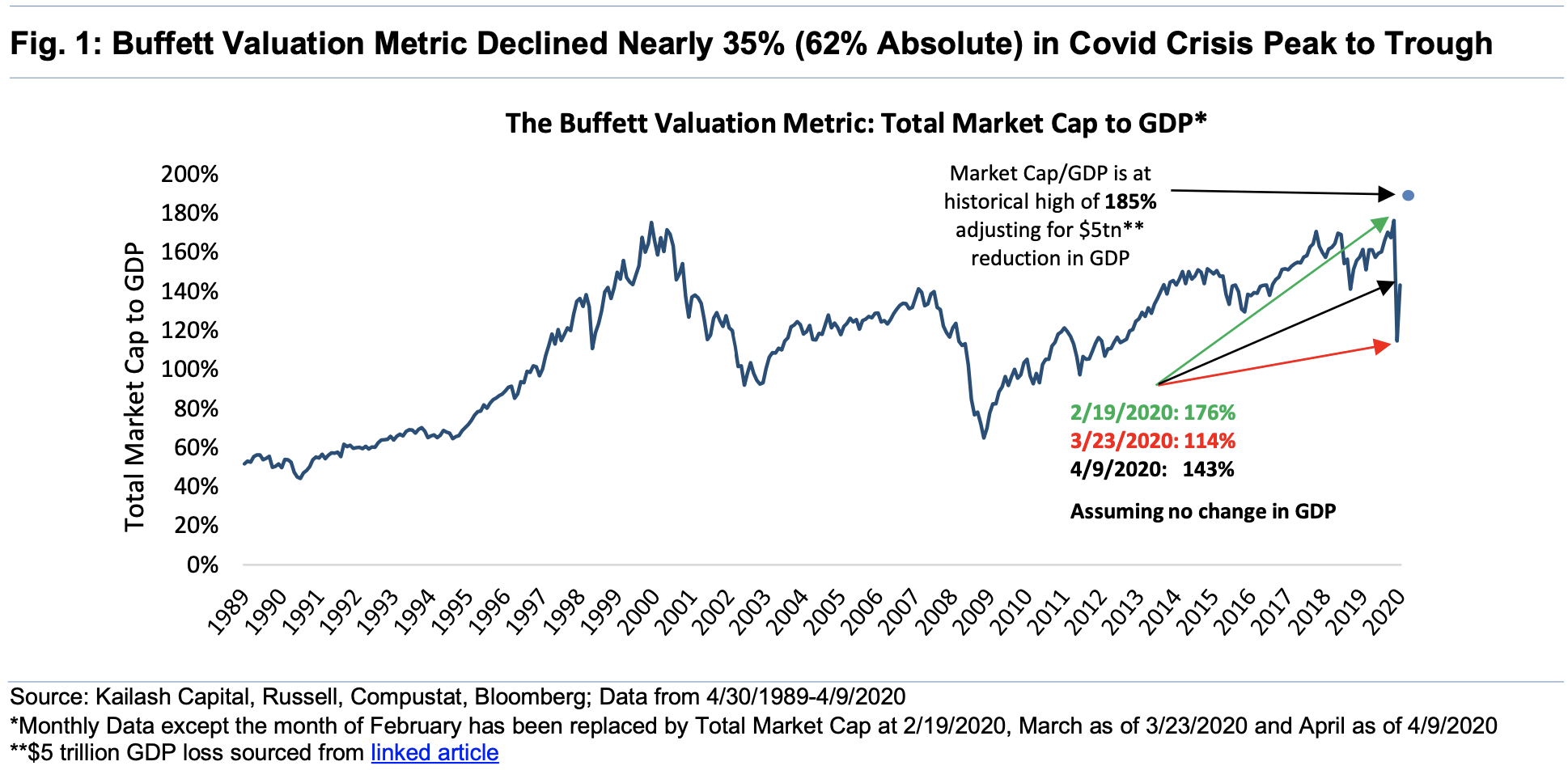 For new readers please see our January piece Why Market Neutral Now where we discussed the case for caution. The paper used Buffett’s valuation metric, market cap to GDP, which is updated through April 9th in Fig. 1 below. Due to the incredible speed at which wealth was destroyed and the stunning snap-back in prices the line is difficult to see. Holding GDP constant from the low on March 23rd until yesterday’s close, valuations have risen from 114% of GDP to 143% of GDP. Investors far wiser than ourselves have reasonably asserted that the current state of affairs will destroy $5 trillion in GDP. If that is the case the effect on valuations, as annotated by the dot in Fig. 1, is stunning. Adjusting for the potential loss in GDP could leave market cap to GDP at record levels even with markets trading roughly 17% below their 2/19/2020 peak.