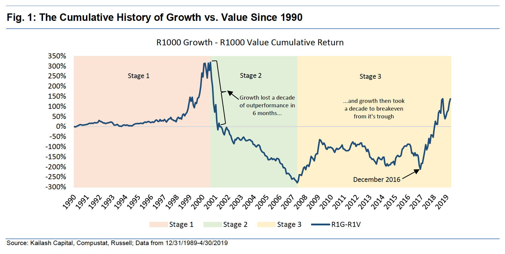 Figure 1 below is republished from part 1 and breaks the growth vs. value story into 3 stages over the last 3 decades. Stage 1 saw growth trounce value by 319% in the 1990’s only to give all of it back in the first 6 months of Stage 2. What is remarkable about this is that in the first 6 months of Stage 2 growth was cut in half while value stocks stood still (this time period is represented by the bracket). From the peak of August 2000 to the trough of May 2007, value outperformed growth by 280%. What stands out to us about the reversal from the trough of 2007 is that it took over 10 years for growth to return to breakeven. However, since December 2016 growth has outperformed value by 2.5x annually, a level that closely approximates the outperformance seen in the subsequent three-year period prior to the peak of the tech bubble.