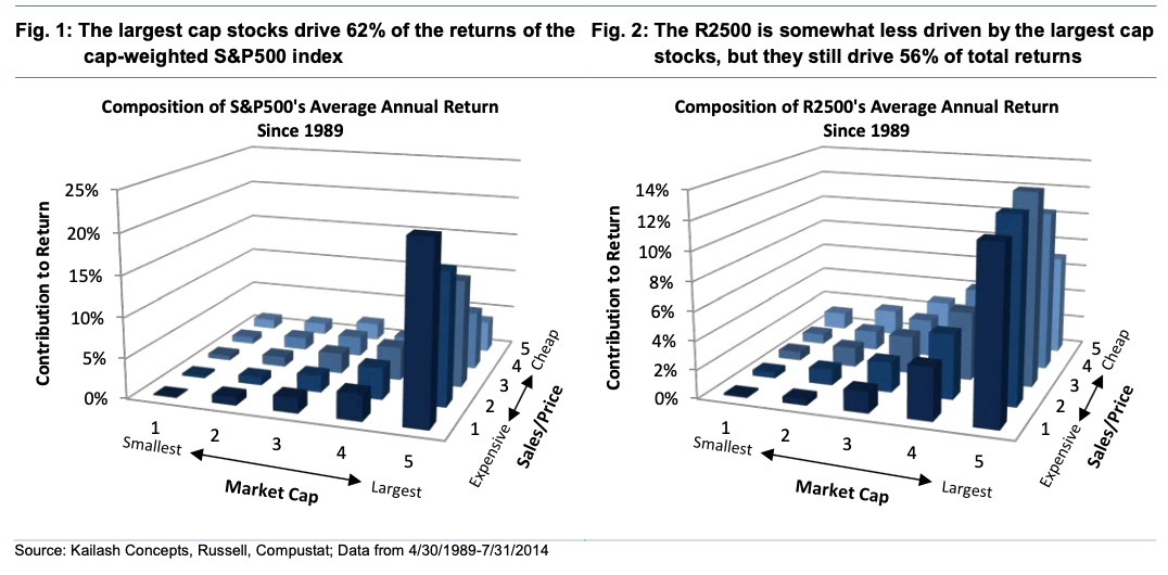 In Figures 1 and 2 below we show the historical contribution to the S&P500’s and Russell 2500’s average annual return sorted by the intersection of size and valuation. What the charts very clearly show is that for both indices, the vast majority of these market cap-weighted returns is coming from the largest quintile of stocks. Historically, the largest 20% of the names has been responsible for 62% and 56% of the S&P500’s and Russell 2500’s average annual returns, respectively. Interestingly, these historical numbers are nearly identical to what we would expect based on current weights within the index as the top 20% of the names in the S&P500 and R2500 represent 63.4% and 55.8% of the index weights, respectively. Even more remarkable, for the S&P500, the most expensive large stocks alone (front right bar in Fig. 1) generated nearly 22% of the benchmark’s absolute average annual return.