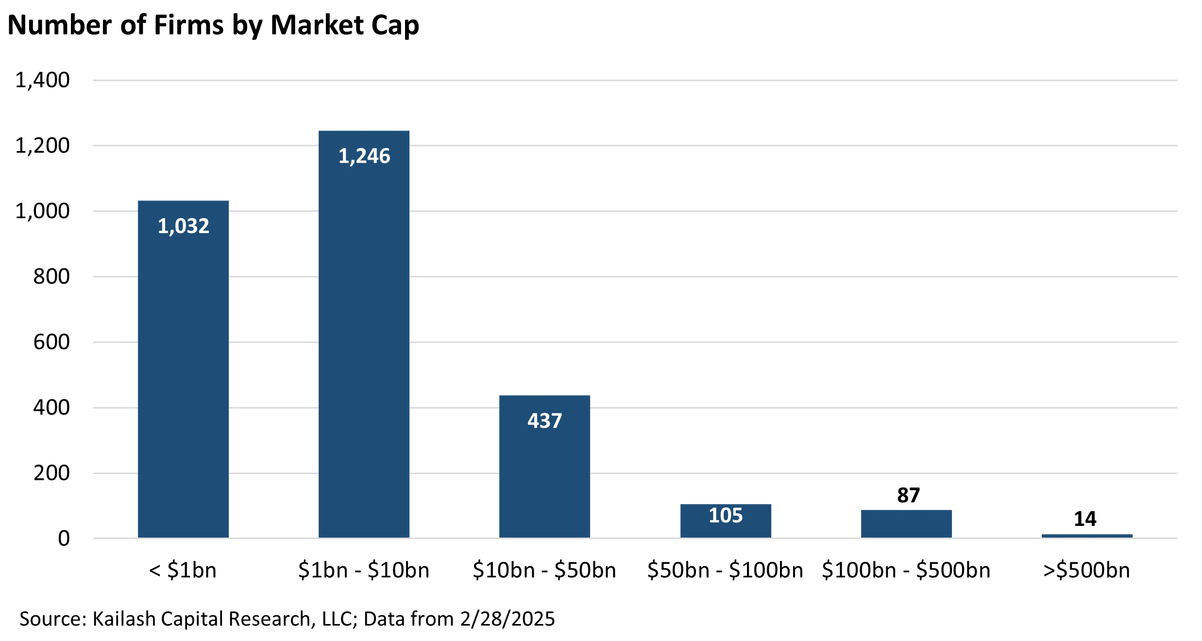 These next two charts go together and help us visualize the problem in a broader context. The top chart shows the number of firms in each market cap cohort. So, for the left-most bar, you can see there are 1,032 stocks that have a market cap of $1bn or less. At the other extreme, the right-most bar, you can see there are only 14 companies that have a market cap of $500bn or more.