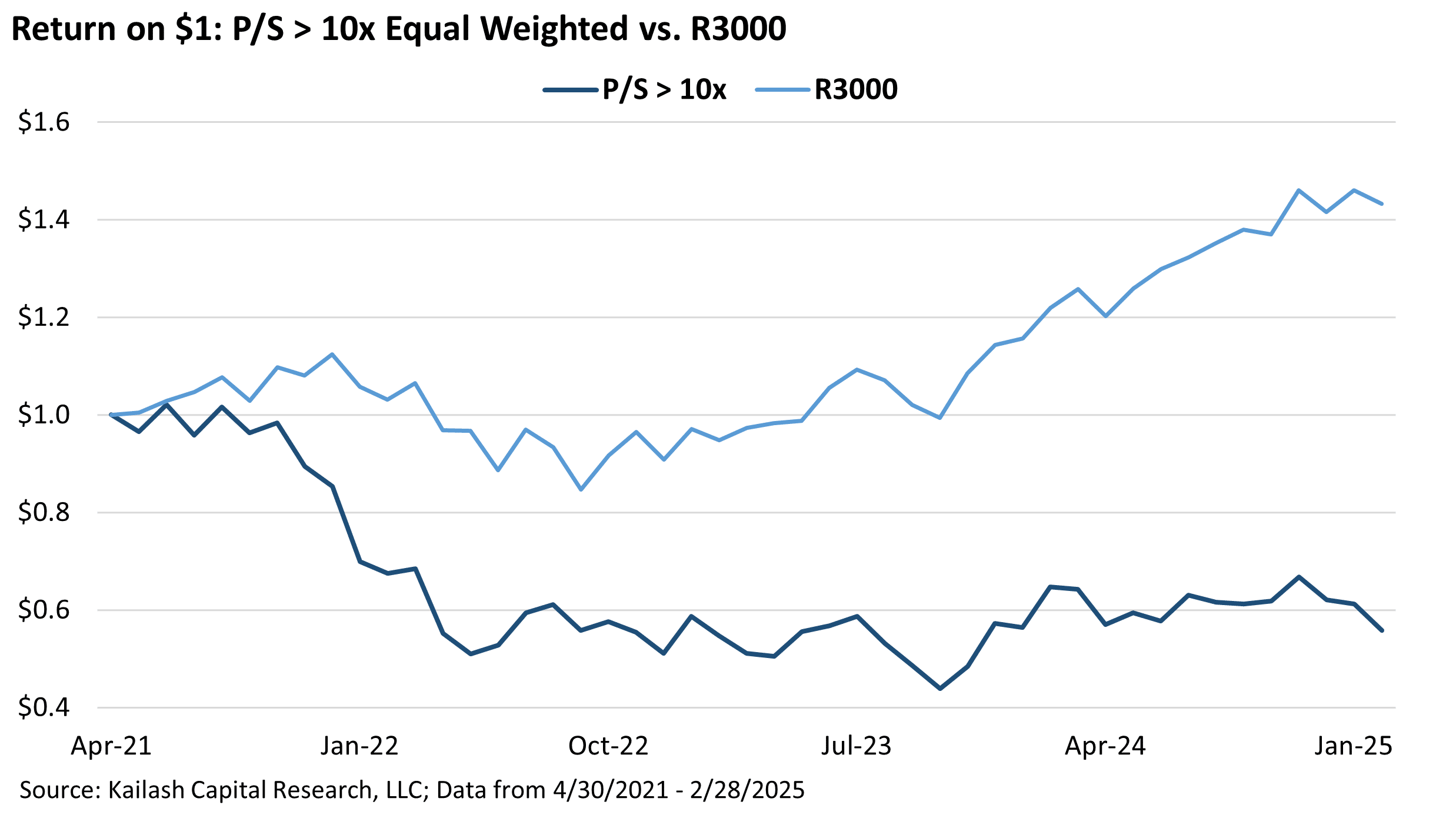 The chart below keeps the light blue line, the return on $1 invested in the Russell 3000 since March of 2021. But now the navy blue line, the return on stocks over 10x price to sales, is calculated weighting every one of these expensive stocks equally.