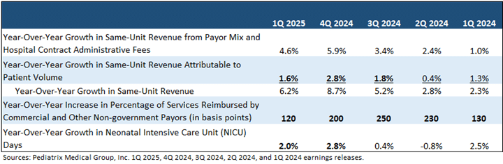 - 2.0% and 2.8% increases in NICU days in 1Q 2025 and 4Q 2024, respectively, drove these gains. See section above on preterm birth trends.