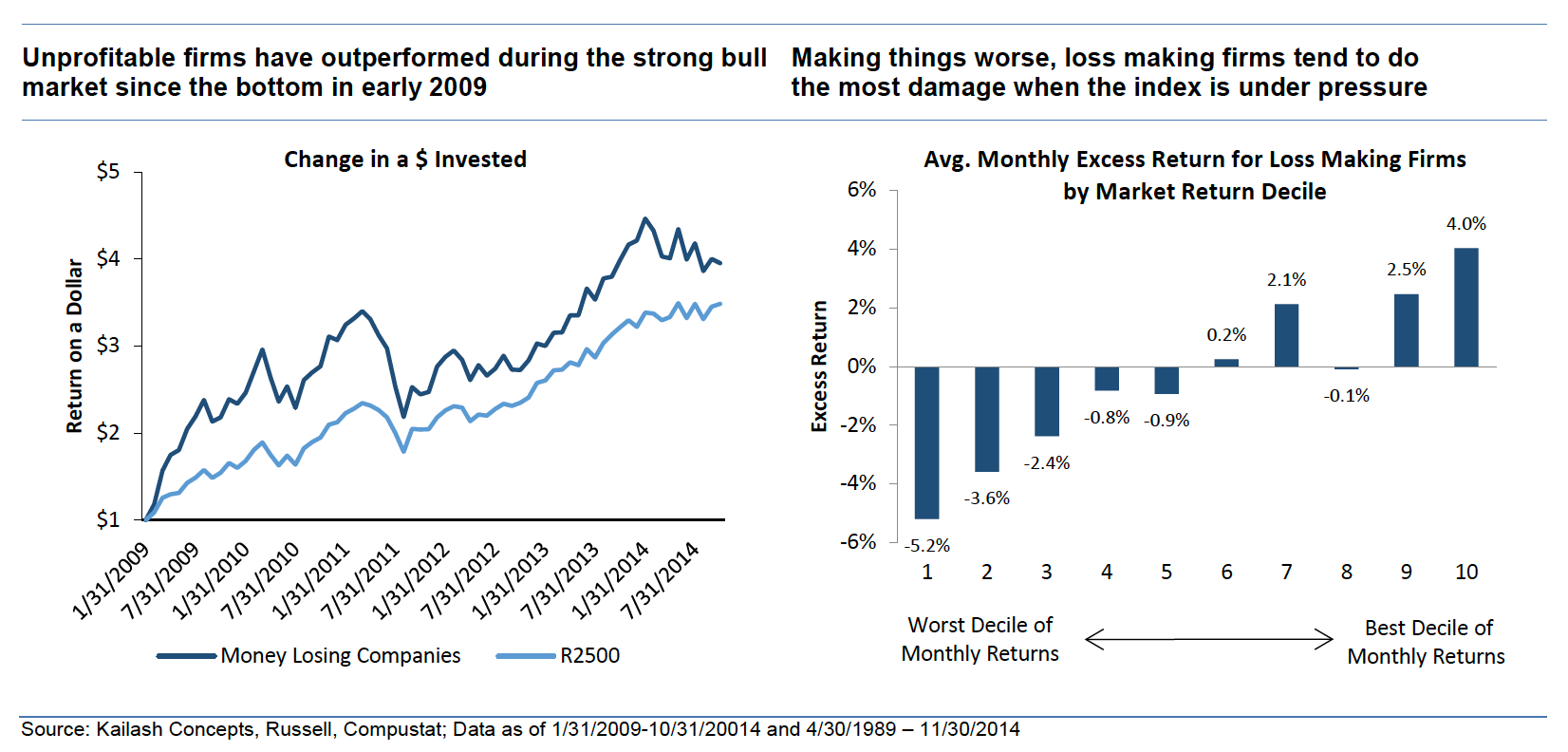 3) The chart below on the left shows that the compound returns to owning just the money losing firms in the Russell 2500 since the bottom of the great recession have actually exceeded the broader index returns. We believe this is notable because, as we show in our paper, unprofitable firms as a group underperform the benchmark 70% of the time on a 1 year basis and 86% of the time on a 3 year horizon. The below chart on the right shows the relative returns to money losing firms sorted by market environment. You can see that while money losing firms tend to be terrible performers in most periods, this is particularly true in downturns.
