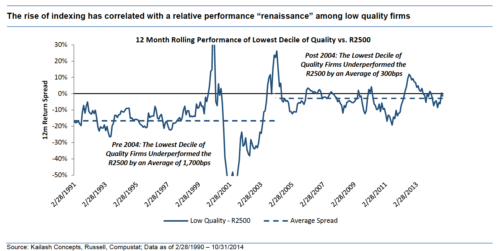 Introduction: As a client of our work we know you are an active manager and hence familiar with the barrage of news stories that seem to revel in our industry’s pain. In fact, just this last Monday the Wall Street Journal had such an article on the front page. Generally speaking, active managers have been under immense and growing pressure over the last decade. As Kailash’s goal is to help clients with our work, we decided to examine some possible reasons for this immense pressure.
