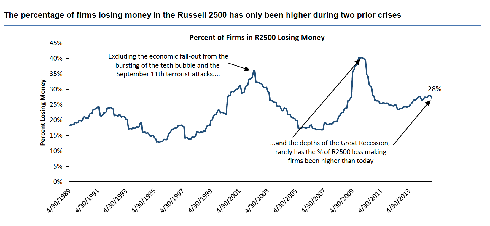 4) Buying index products now gives investors significant exposure to the performance of unprofitable companies. Active managers may want to explain to their customers that part of the reason index funds have been difficult to beat is we are now well into our fifth year of a strong bull market post the Great Recession—an environment in which loss making firms’ stocks can thrive. Maybe now might prove a suboptimal time to buy an index fund loaded with near record amounts of loss-making firms!