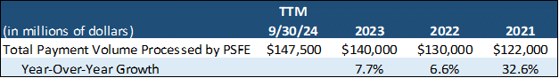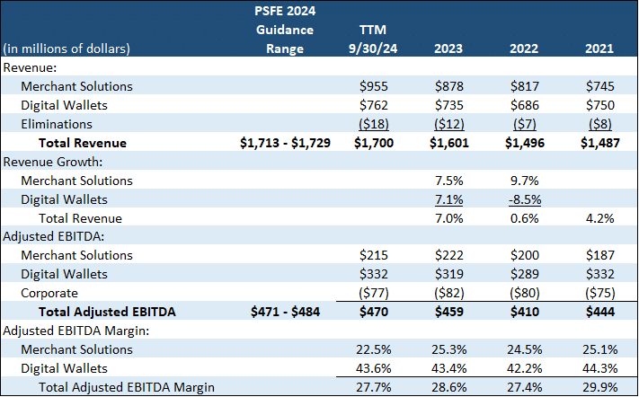PSFE’s revenues are the transaction fees it assesses based on either a percentage of the transaction dollar volume or a fixed fee for each transaction, or a combination of the two. The fees are assessed when funds are loaded onto digital wallets, when these funds are used to make a transaction, and when PSFE processes a credit or debit card transaction for merchants on its system.[16] Notably, these fees are small on a percentage basis and therefore fairly easily tolerated by consumers; they represent only about 1% in aggregate of the dollar amount of digital commerce transactions processed by PSFE ($1.6 billion of PSFE’s 2023 revenue divided by $140 billion of digital transactions handled by the company).