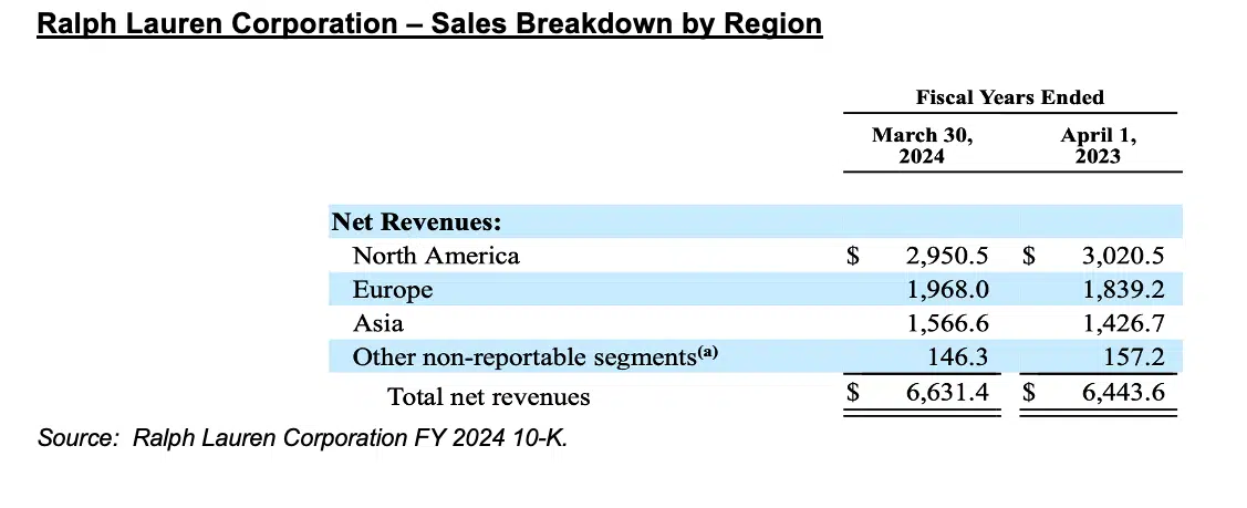 RL’s business is well diversified by geography. Sales are split between North America (44%), Europe (30%), and Asia (24%). Importantly, China represents only about 6% of the company’s revenue, measurably smaller than many other luxury retailers.[5]