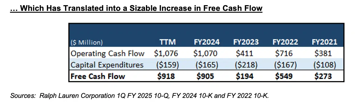 RL’s free cash flow generation has increased at an even faster rate. Over the most recent twelve months, the company has generated free cash flow of $918 million ($14.82 per RL share), up from $194 million in FY 2023, and $549 million in FY 2022.