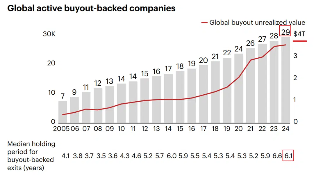 - The chart below, from Bain, shows that not only are there 29,000 companies valued at ~$4 trillion dollars waiting for an exit, but the median age they have been sitting in a portfolio is now 6.1 years